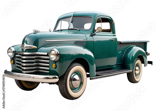 A classic emerald green pickup truck from the 1940s, isolated on a transparent background, representing vintage automotive design
