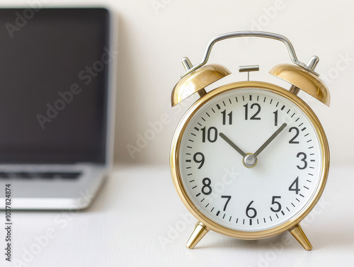 A classic gold alarm clock sits beside a modern laptop on a minimalistic desk, blending vintage charm with contemporary technology.
