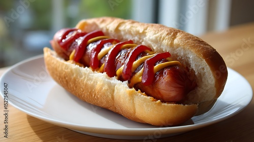 hot dog, bun, ketchup, mustard, white plate, food, meal, sausage, condiment, table, indoor, simple, appetising, ready-to-eat