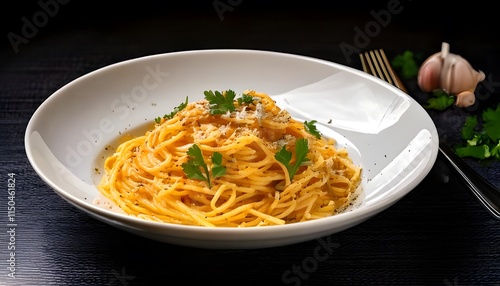 A classic Italian dish, spaghetti aglio e olio, glistening with olive oil, garlic, and chili flakes, topped with parsley and grated cheese, served in a white bowl with rustic charm