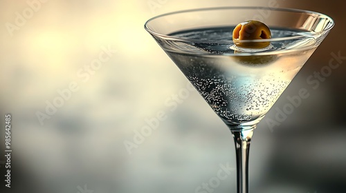 A classic Martini cocktail in a sleek martini glass, clear liquid garnished with an olive, set against a bright white background, minimalistic composition, soft lighting. --ar 16:9 --no logo