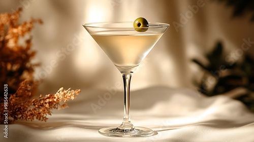 A classic Martini cocktail in a sleek martini glass, clear liquid with an olive garnish, on a white background, soft shadows, elegant lighting, minimalistic style. --ar 16:9 --no logo