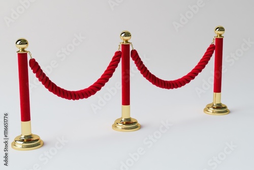 A classic set of red velvet ropes attached to shiny gold stanchions isolated on a white background