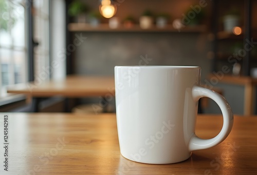 .A classic white ceramic coffee mug placed on a wooden table, isolated with soft lighting, ideal for branding and custom designs. generate ai.