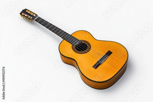 A classical guitar's intricate beauty rests elegantly on a clean surface