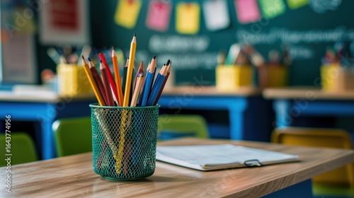 A classroom with a green pencil holder containing colored pencils, a notebook, and a chalkboard in the background.