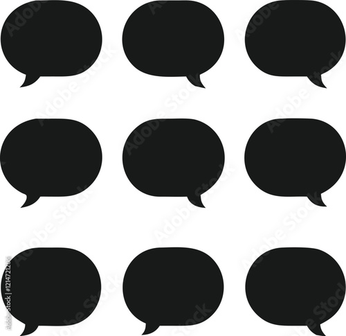 A clean and modern graphic of nine simple black speech bubbles arranged in a 3x3 grid against a pure white background.