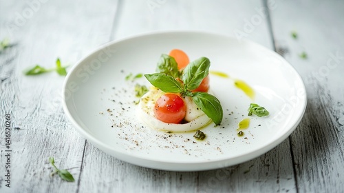 A clean white plate of caprese salad with fresh basil, placed on a light wooden table digital