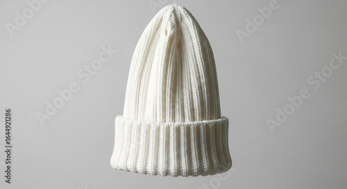 beanie, hat, winter, knit up, ribbed, white, clean, cosy, suspended, floating, hanging, fashion, accessory, apparel, clothing, headwear, texture, warm, cold, weather, folded, cuff, simple, minimalist, style, design, template, isolated, studio, light, grey, knitwear, wool, cotton, comfort, modern, classic, head, gear, pom-pom, plain, blank, empty, space, detail, closeup, form