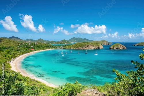 A clear blue sky and turquoise sea in the Caribbean, featuring emerald green water and sandy beaches. The photo captures an idyllic beach scene with calm waters and distant boats on the horizon.