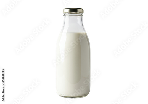 A clear glass bottle filled with fresh white milk, isolated on a transparent background