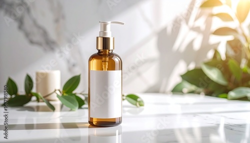 A clear glass bottle with a pump dispenser, filled with amber liquid, stands on a marble surface surrounded by green leaves, with soft sunlight dappling through