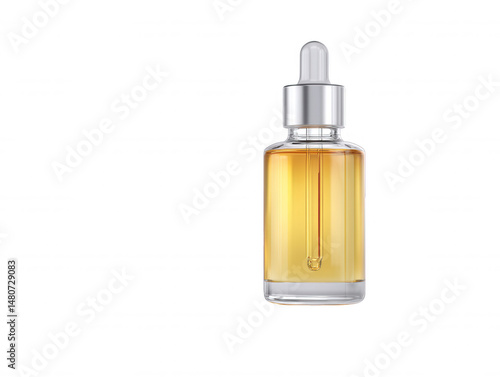 A clear glass bottle with a silver top and dropper, filled with golden liquid, sits isolated on a clean white background, showcasing beauty and wellness at its fi.