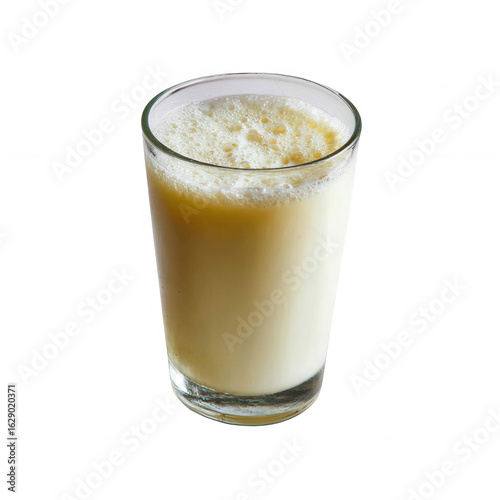A clear glass filled with a refreshing creamy beverage topped with froth, set against a white isolated background, ideal for showcasing delicious drinks.