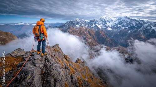 climber, mountain, landscape, adventure, exploration, cloud, gear, altitude, nature, scenery, peak, hiking, rock, summit, thrill, challenge, freedom, wilderness, beauty, height, journey, travel, sport, sky, terrain, view, life events, ascent, trek, environment, peak, snow, sunlight, photo, rugged, infused, breathtaking, calmness, solitude, excitement, fitness, resilience, passion