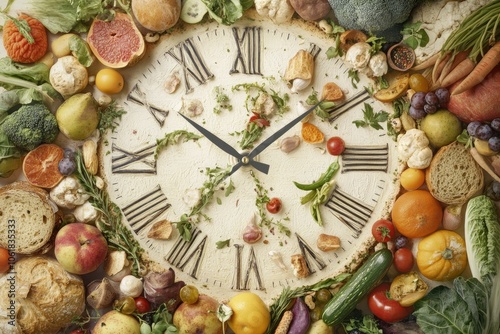 clock, time, food, rot, decay, spoiled, rotten, molded, fungal, vegetable, fruit, bread, orange, red, green, yellow, brown, white, black, grape, tomatoes, cucumber, garlic, onion, lemon, pear, apple, peach, kiwi, pumpkin, broccoli, lettuce, dill, rosemary, rye, crust, gourd, pepper, stalk, leaf, spore, moldy, decomposition, timeless, ageing, nature, life