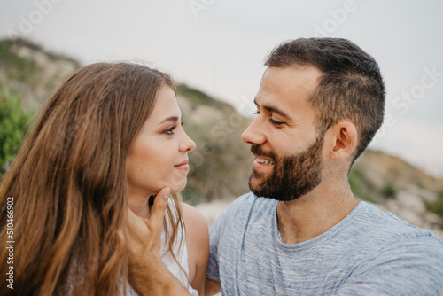 A close photo of a smiling Hispanic man who is stroking with his hands the face of his Latina girlfriend on the rocky sea coast in Spain. A couple of tourists in the evening on the hills in Valencia
