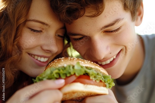 couple, burger, sharing, joy, close, together, companionship, bond, delight, smiling, smile, happy, love, adorable, friendship, lifestyle, fast food, romance, affection, meal, young, intimate, harmony, youthful, leisure, closeup, peace, calm, romantic, empathy, care, cherish, warmth, authentic, moment, partiality, togetherness, connection