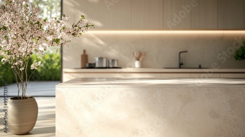 kitchen, countertop, table, surface, white, beige, light, modern, interior, design, room, home, decor, style, minimal, clean, empty, space, background, furniture, house, architecture, natural, marble, stone, smooth, glossy, shine, shiny, texture, pattern, wood, carpenter's shop, cabinet, sink, faucet, plant, pot, window, glasses, floor, sunlight, shadow, bright, minimalism, contemporary, stylish, elegant, simple