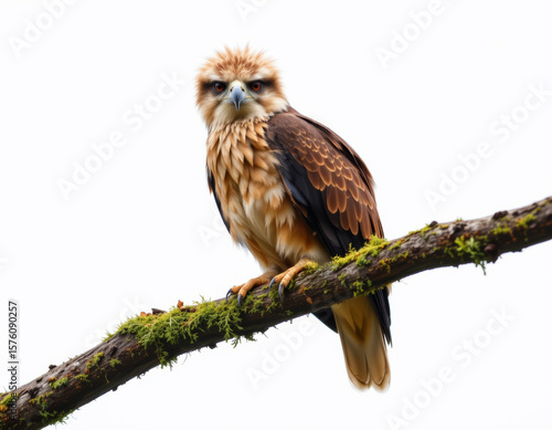 close, eagle, shaggy, crest, piercing, eye, perched, mossy, tree branch, isolated, white, background, elegant, framing, high, feather, clarity, eye, contact, ai, generative