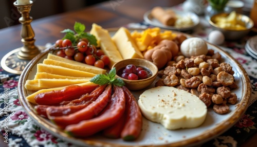 A close up of a Seder plate with symbolic foods arranged artfully on a decorative table.