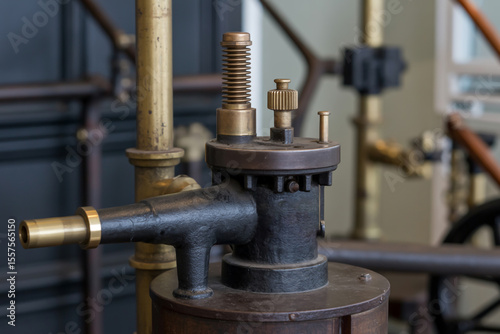 A close up of a vintage machine with brass and black metal components in a workshop setting indoors