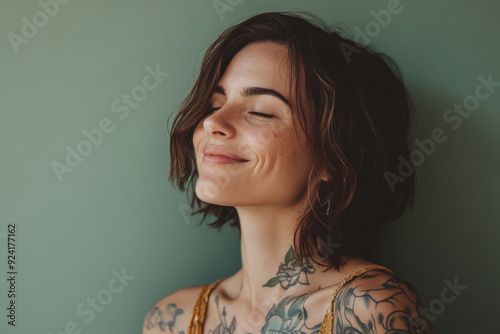 smile, girl, nose, tattoo, health, cheek, hair, lip, shoulder, eyelash, ear, neck, flash, jaw, lipstick, make-up, gesture, happy, makeover, black, long, step, brown, art, layered, peach, portrait, fashion, fun, illustration, photo, beauty, face, model, skin, clean, make-up, eye, young, person, care, skincare, glamour, fresh, lip, natural, studio, closeup, spa