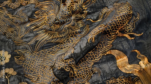 fabric, dragon, gold, black, texture, pattern, embroidery, silk, satin, asian, chinese