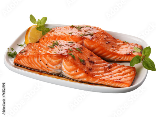 A close up of the grilled salmon steak isolated on transparent background.