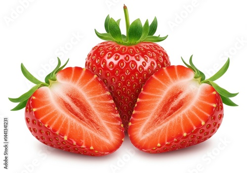 A close up of three strawberries, one whole and two cut in half, with green leaves on a white background