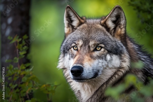 A close up picture of a grey wolf (Canis Lupus), also called a timber wolf, in the Canadian forest in the summer. Generative AI