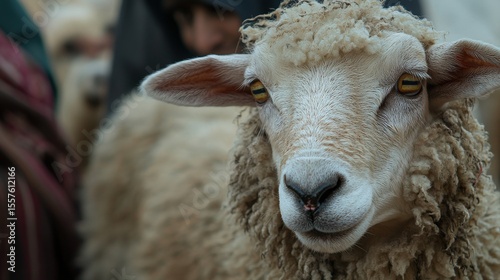animal, sheep, wool, fluffy, close, head, eye, nose, ear, fur, face, farm, farm animal, portrait, looking, sharpened, detail, nature, rural, white, beige, brown, texture, wild, creature, mammal, domestic, environment, agricultural, grazing, herd, field, woolly, pasture, gentle, innocent, calm, peaceful, sunlight, background, blur, person, people, light, serene, awareness