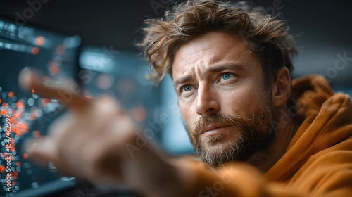 A close up portrait of a focused serious looking man with curly hair and a beard wearing a yellow jacket intently operating a complex technological dashboard or control panel