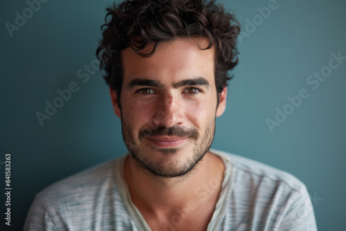 A close up portrait of a young man with a subtle smile