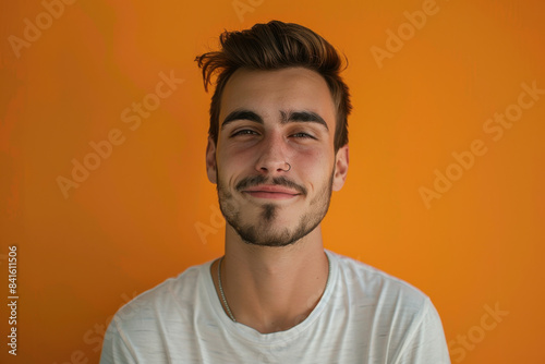 A close up portrait of a young man with a subtle smile