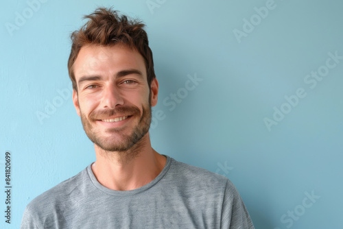 A close up portrait of a young man with a subtle smile