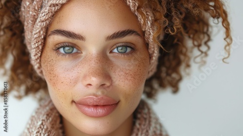 woman, portrait, face, close, up, freckle, curly, hair, knit up, headband, green, eye, brown, smiling, looking, female, beauty, model, fashion, style, natural, skin, young, adult, casual attire, relaxed, confident, happy, attractive, pretty, cute, gorgeous, beautiful, head shot, shot, soft, light, background, indoor, studio, photo, picture, digital, visual, art, aesthetic, lady