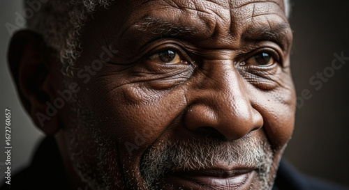 A close up portrait of an elderly african american man with gray beard and detailed skin texture