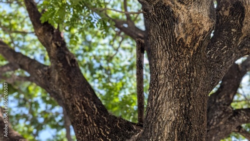 A close up shot focusing on the textured bark of a tree trunk. The large, dark branches extend out of frame, with a soft focus of green leaves and sky in the background.