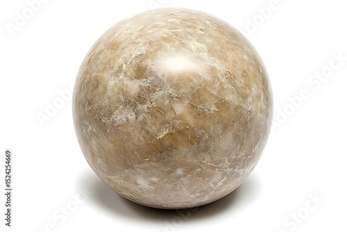A close up shot of a beige marble sphere with white veining on a white background in soft lighting