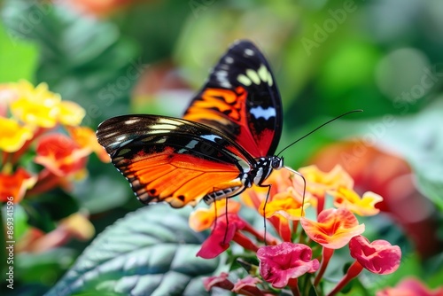 A close up shot of a brightly colored butterfly perched on a vibrant flower.