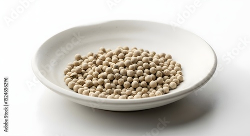 A close up shot of a white bowl filled with white peppercorns on a white background