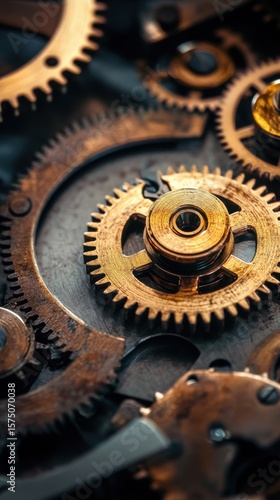 A close up shot of several interlocking golden and brown gears with detailed textures and shadows