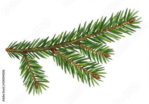 A close up view of a green fir tree branch with needles and small cones on a white background scene
