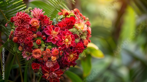 A close up view of a heart shaped floral arrangement with intricate details set against natural background