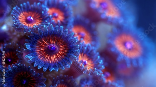 A close up view of vibrant zoanthid corals with blue and orange colors in a marine environment
