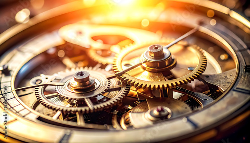 A close up view showcases intricate gold gears and mechanisms of an antique clock, symbolizing time and precision.