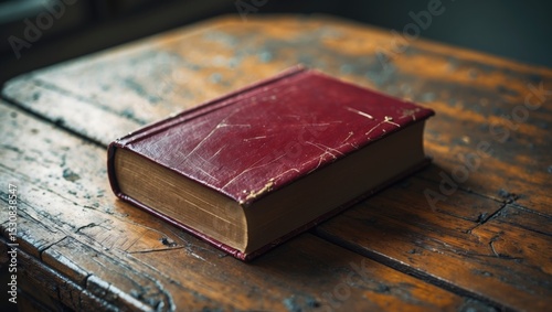 A closed book with a red hardcover rests on an aged wooden table. An accompanying background story.