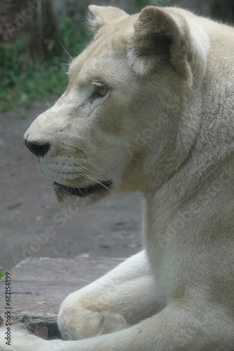 A close-up white lions are a rare color variation of the African lion (Panthera leo). They get their distinctive white or very pale coloration|母獅子