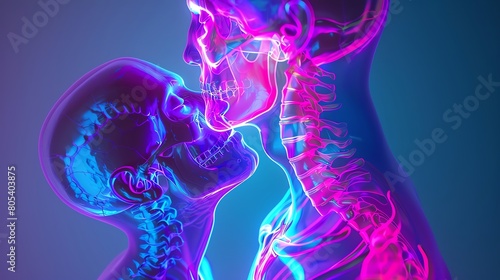 A close-up 3D x-ray of a couple's embrace, with each vertebra and rib highlighted in a different shade of neon